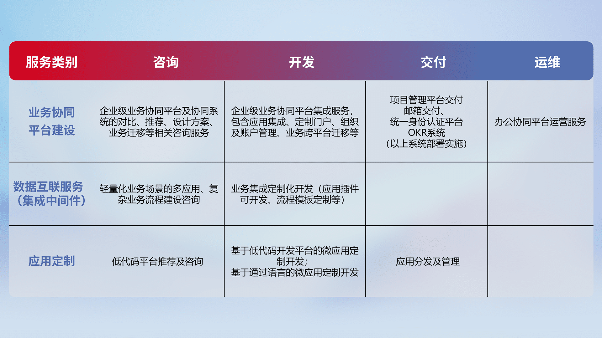 针对钉钉、、、、企微、、、、IDaas等平台级产品提供产品的规划、、方案、、交付、、、、定制化开发等服务,,,,实现如统一协同办公、、、智能客户服务、、、混合会议管理、、、、智能数据查询、、、等业务场景,,,实现数字化转型。。